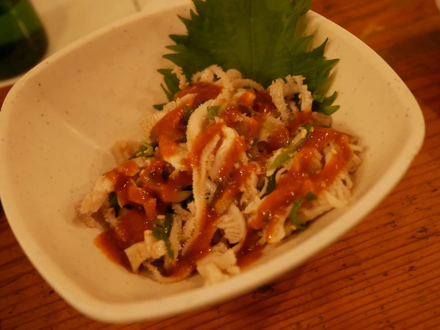 タレはBBQソース×コチュジャンを混ぜ合わせたような少しピリ辛系の味で、センマイにしっかりと絡んでくれます◎